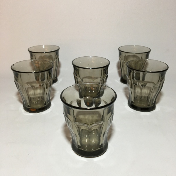 • Belo 6 copos em cristal fumê.Dimensões: 8,7 cm  / 100 ml.