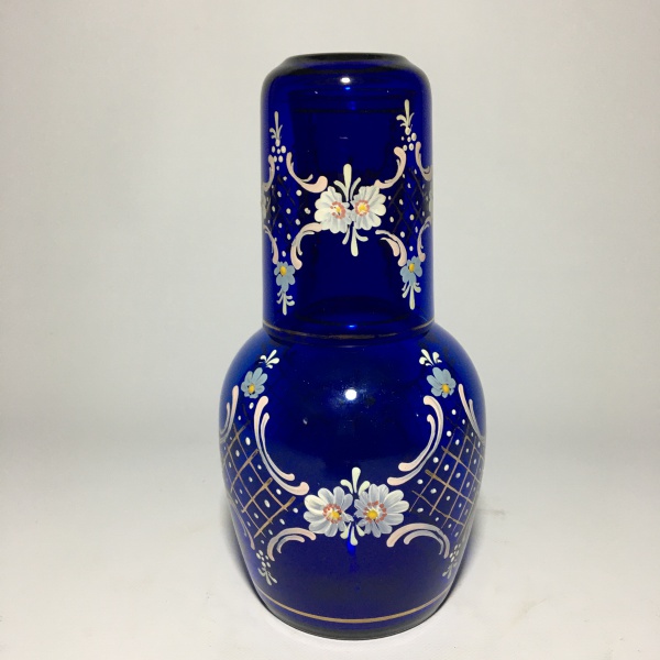 • Antiga e delicada moringa em vidro azul, estilo veneziano, decorada com flores, volutas e estilizados pintados à mão. Realces em Ouro 24k. Exemplar em excelente estado. Dimensões: garrafa 19 cm / copo 9,5 cm.