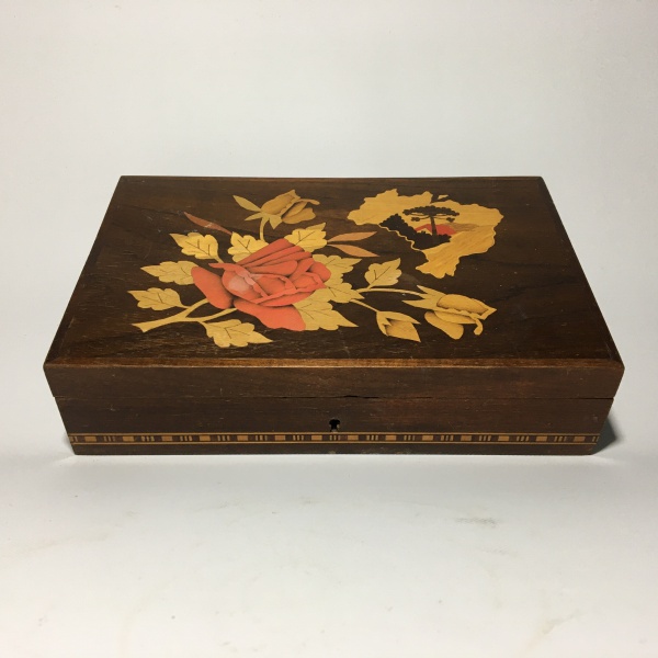 • Antiga e bela caixa em madeira marchetada, formato retangular, decorada com faixa em tons claro e tampa com imagem de rosa e contorno do território brasileiro. Presença de arranhões e de desgaste. Não possui chave. Dimensões: 5,5 cm x 15 cm x 23 cm.