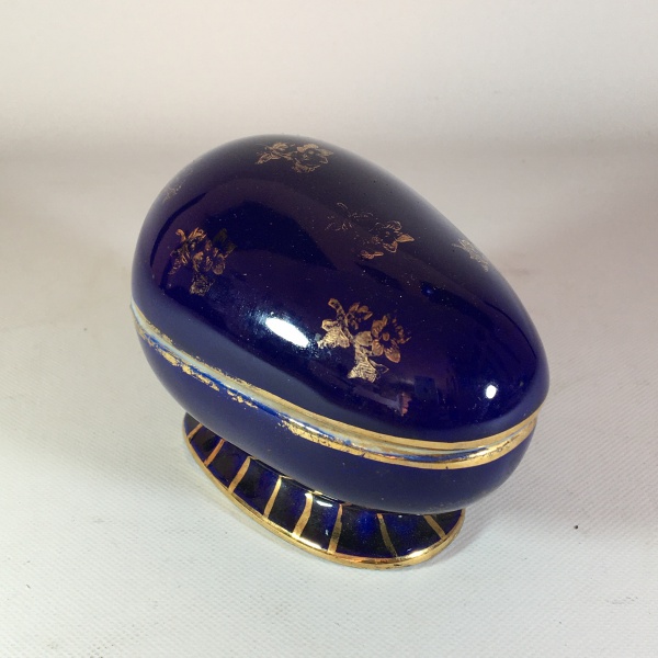• Antigo e delicado pote oval em porcelana esmaltada na cor azul cobalto com detalhes gravados à Ouro. Pequenos sinais de desgaste. Dimensões: 8 cm x 7 cm x 11 cm.