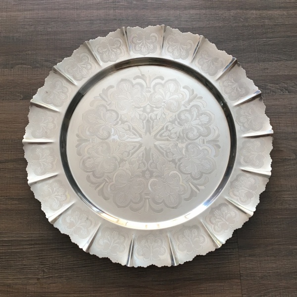 • Belíssima bandeja em metal cinzelado decorada com flor de lis e estilizados vegetalistas incrustados em toda superficie e borda serrilhada. Dimensões: 44 cm.