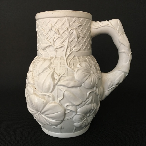 • Antiga caneca de origem portuguesa em porcelana, decorada com arranjos florais. Apresenta trinca na parte superior. Dimensões: 17 cm x 14 cm x 11 cm.