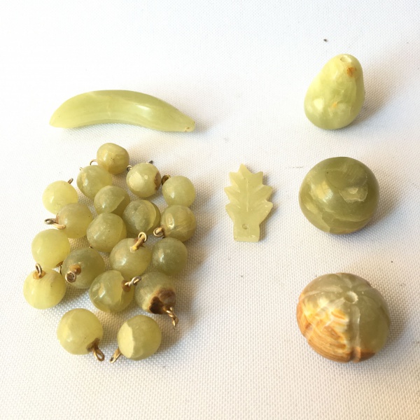 • Conjunto com 24 peças de alabastro no formato de frutas e folha. Dimensões: maior peça mede 7 cm.