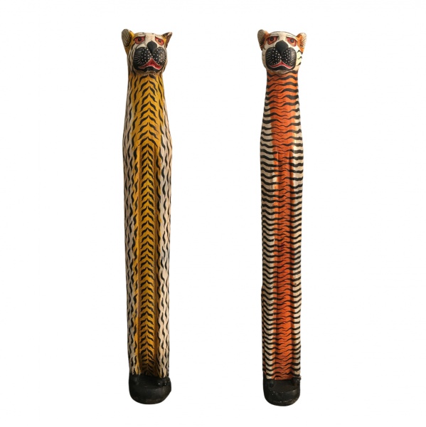 • BALI - Par de grandiosas esculturas de felinos esculpidos em bloco de madeira policromado. Retirada somente por transportadora feito pelo arrematante. Dimensões: 150 cm (cada)