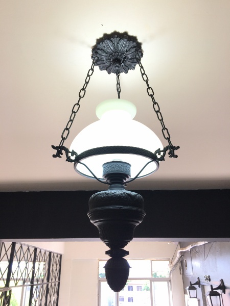 • Antiga luminária em metal com partes em resina na cor preta,com cúpula em vidro. Dimensões: 65 cm com a corrente.. Retirada somente por transportadora feito pelo arrematante