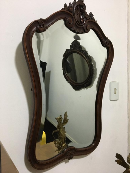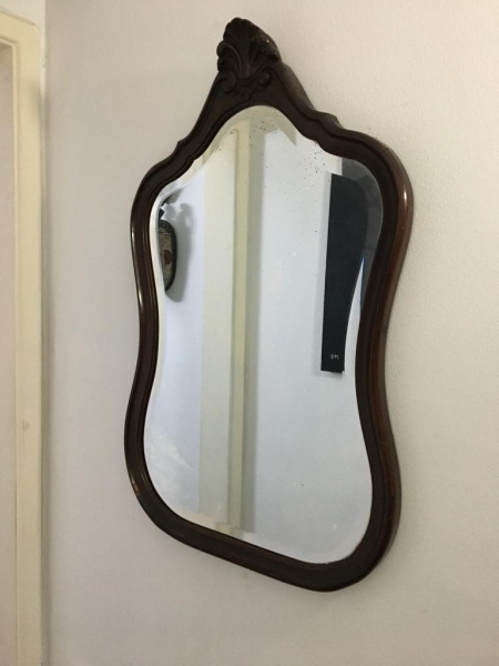 • Belo espelho em madeira decorado com florão na parte superior. Dimensões : aprox 90 cm.