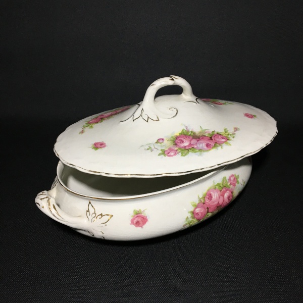• HUGHES LONGPORT ENGLAND - Antiga terrina em faiança do anos 40,  decorada com arranjos florais. Alças e pega no formato de folhas de acanto. Realces pintados à Ouro. Presença de craquelados. Exemplar de número 3942. Dimensões: 14 cm x 19 cm x 30 cm.