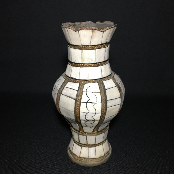 • Antigo vaso marroquino em cobre, revestido com placas de osso. Faltam duas placas. Dimensões: 28,5 cm.