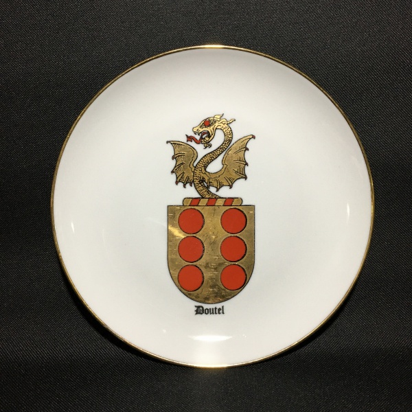 • COLEÇÃO DE BRASÕES DE FAMILIAS PORTUGUESAS - BELPORCE - ALMADA - PORTUGAL - Prato em porcelana esmaltada ostentando brasão da familia DOUTEL. Exemplar com detalhes pintado à Ouro. Presença de pequenos arranhões. Dimensões: 21 cm diâmetro.
