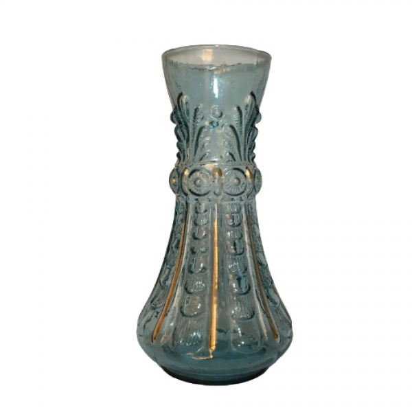 • Belo e antigo vaso em vidro azul decorado com estilizados e folhas de acanto em alto relevo. Realces pintados à ouro com desgaste. Dimensões: 25 cm altura.
