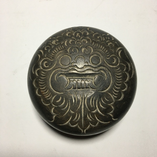 • Antigo pote circular em madeira, decorado com figura de dragão e detalhes vegetalistas entalhadas. Dimensões: 7 cm x 9,5 cm.