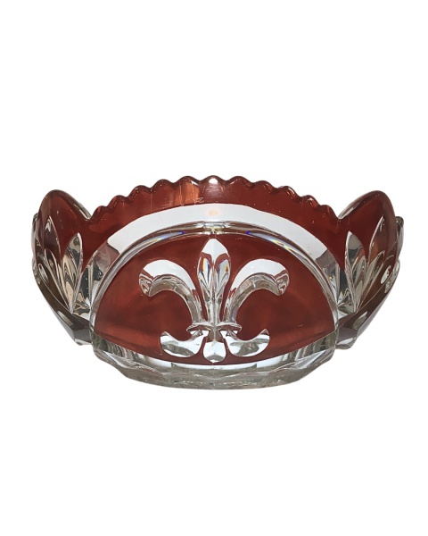 • Elegante centro de mesa de vidro, decorado com flor de lis e estilizados lapidados sobre fundo vermelho. Exemplar com pequenos arranhões. Dimensões: 11 cm x 24 cm / 1,6 kg.
