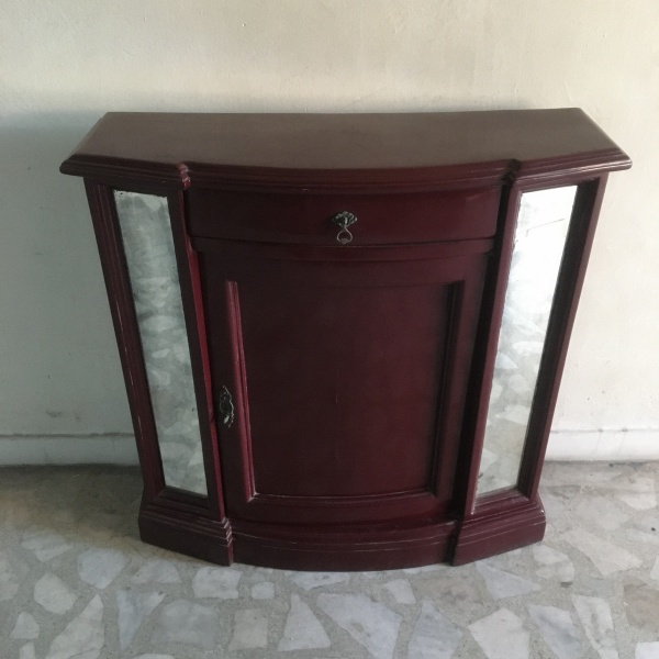 • Antigo aparador em madeira laqueada, decorado com espelhos laterais, interior dividido por prateleira e gaveta na parte superior. Espelhos com manchas e pequenos sinais do tempo. Móvel em excelente estado. Dimensões: 100 cm x 90 cm x 25 cm.