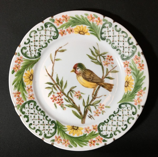 • Belo prato de coleção em porcelana esmaltada, decorado com pássaros e arranjos florais pintados à mão. Dimensões: 24 cm.