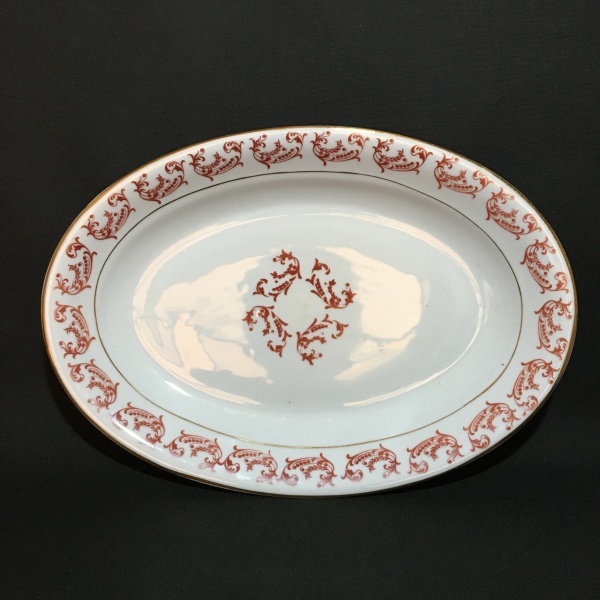 • RIO BRANCO - Antiga travessa em porcelana esmaltada, decorada com detalhes vegetalistas na cor vermelho escuro e filetes à ouro. Dimensões: 24 cm x 34 cm x 4,5 cm.
