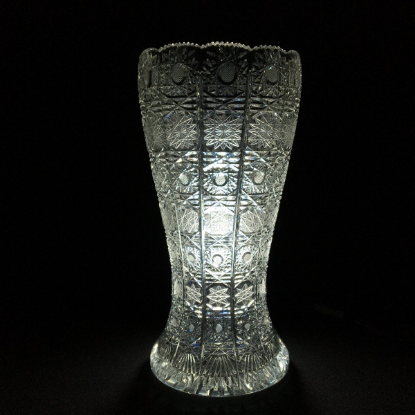 • Robusto e elegante vaso em cristal, possivelmente de origem Europeia, ricamente lapidado com detalhes geométricos. Borda serrilhada. Exemplar em excelente estado. Dimensões: 37 cm x 18 cm. / 3,8 kg