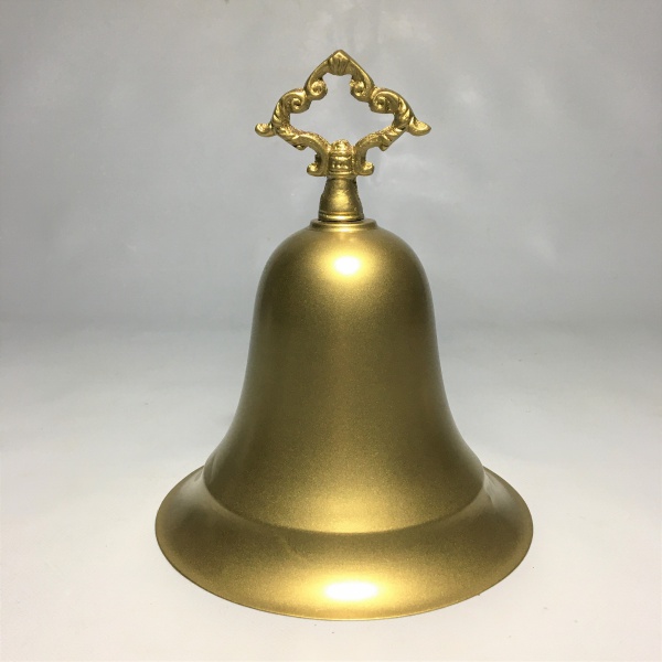 • Antigo sino em metal revestido de dourado com alça decorada em arabescos. Sem a parte sonora. Dimensões: 18 cm x 15 cm./200g
