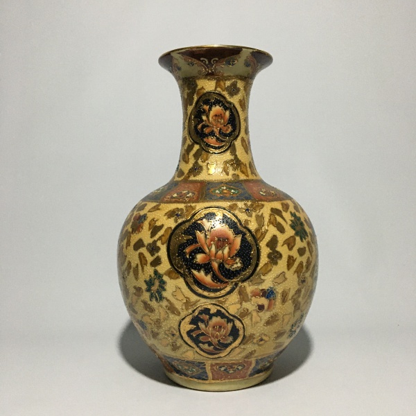 • CHINA - Belo e robusto vaso em cerâmica SATSUMA, decorado com faixas, folhas e galerias. Dimensões: 31 cm x 19 cm.