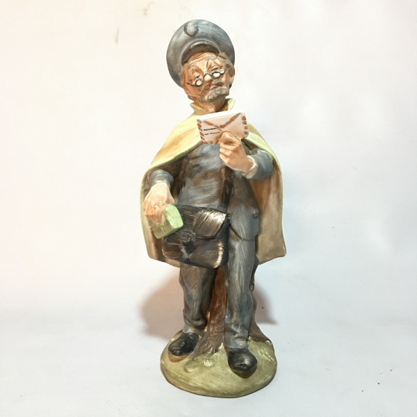 • Antiga escultura de carteiro feita em massa de porcelana policromada. Dimensões: 24 cm.