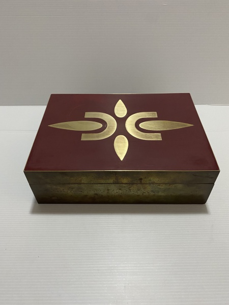 • Caixa de madeira retangular, revestida de metal dourado e tampa decorada com figura estilizada sobre fundo vermelho. Interior revestido com tecido preto. Sinais de desgaste. Dimensões: 8 cm x 18 cm x 25 cm.