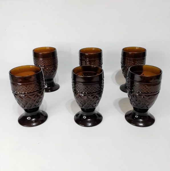 • Seis taças em vidro bico de jaca na cor âmbar. Dimensôes: 11 cm x 6,5cm.