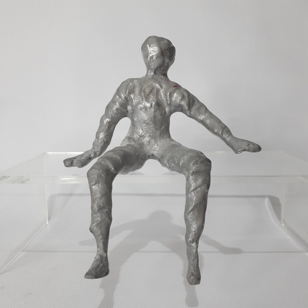 • Estatueta figurativa em metal prateado. Dimensões: 19 cm x 15 cm.