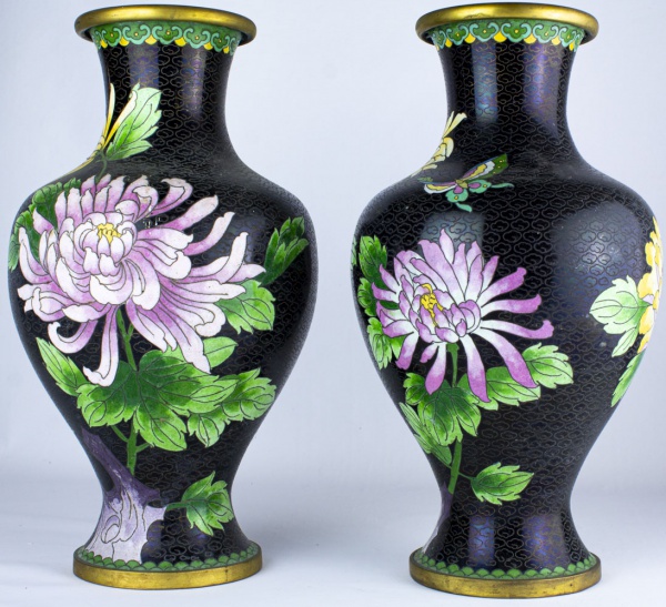 • ARTE ORIENTAL - Par de jarras Cloisonné decoradas com arranjos florais sobre fundo preto. Dimensões: 30 cm. A técnica cloisonné é de origem bizantina e foi introduzida na China no século XIV. Sobre um objeto fabricado em metal, geralmente em cobre, aplicava-se um conjunto de finos fios dourados formando os contornos dos motivos desejados. Os favos, ou "cloisons", eram depois preenchidos com esmaltes coloridos, fortemente comprimidos e polidos até atingirem o acabamento desejado.
