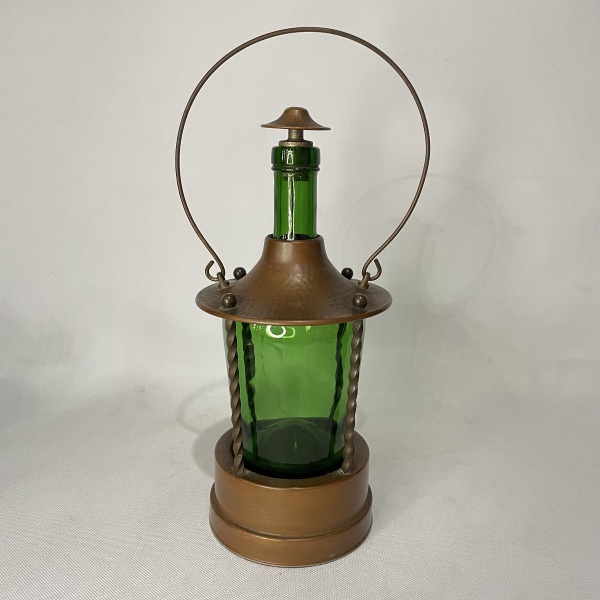 • REUGE - ITALY  - Bela garrafa musical em vidro na cor verde , no formato de lampião, com estrutura em cobre. Máquina não esta funcionando, precisando de regulagem. Dimesões: 26cm altura.