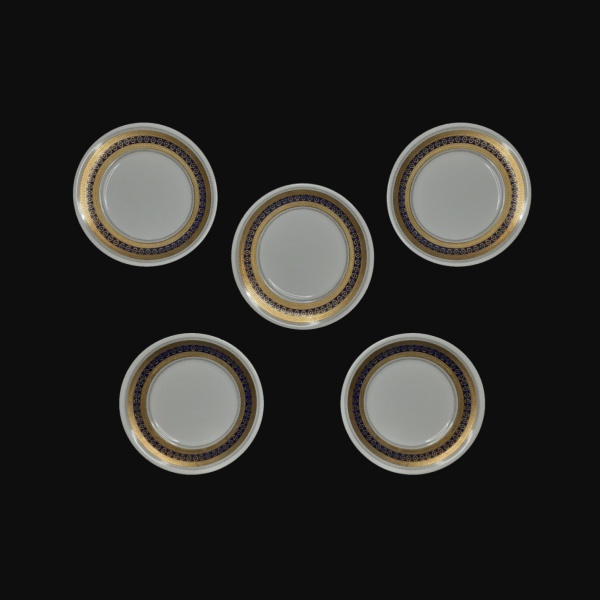 • Elegante conjuntos com 5 pires em porcelana esmaltada, decorados com faixa azul e estilizados gravados à Ouro.  Pequenos desgastes. Dimensões:  11 cm .