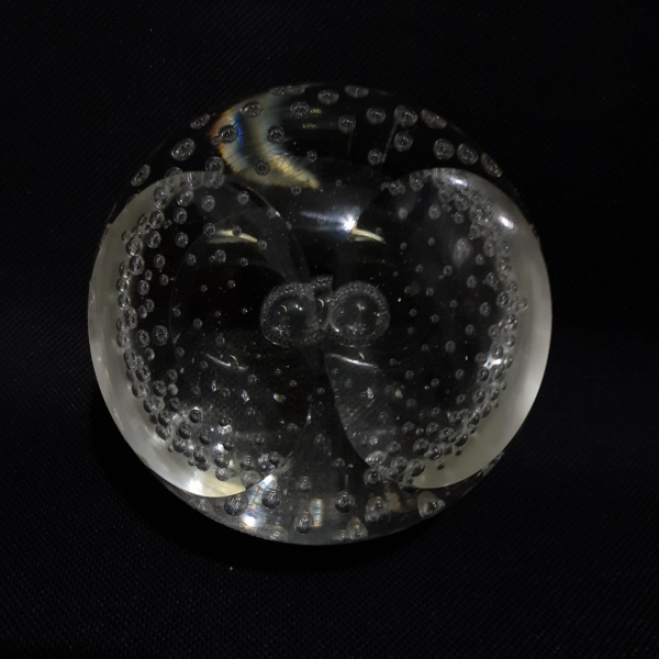 • MURANO - Bela esfera em pasta de vidro translúcido, decorado com micro bolhas em seu interior. Pequeno defeito de fabricação no fundo. Dimensões: 8 cm de diâmetro. Peso 800 g.