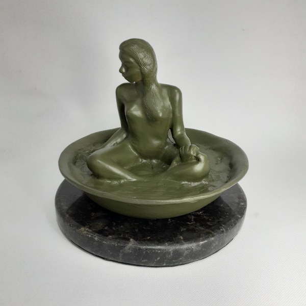 • Bela escultura de jovem mulher se banhando , construída em massa dura. Sobre base de mármore preto. Dimensões : 17 cm x 20 cm .