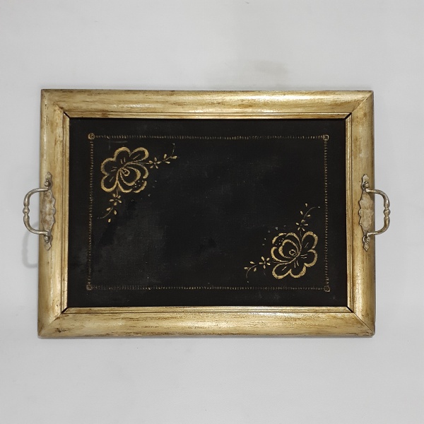 • Antiga bandeja feita de moldura de quadro na cor dourada com fundo em tecido preto decorado com flores. Dimensões: 36 cm x 50 cm .