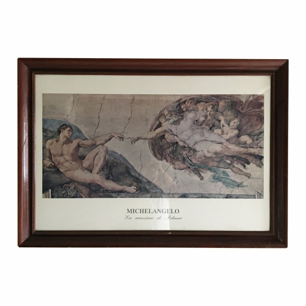 • MICHELANGELO - Bela e grandiosa reprodução " La creazione di adamo " emoldurada e com vidro de proteção . Pequenas manchas do tempo.  Dimensões : 95 cm x 135 cm. Retirada somente por transportadoras.