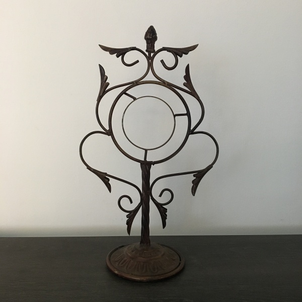 • Antiga e delicada armação para relógio em metal revestido de cobre decorado com folhagens. Presença de pequenos amassados na base. Dimensões: 44 cm x 25 cm.