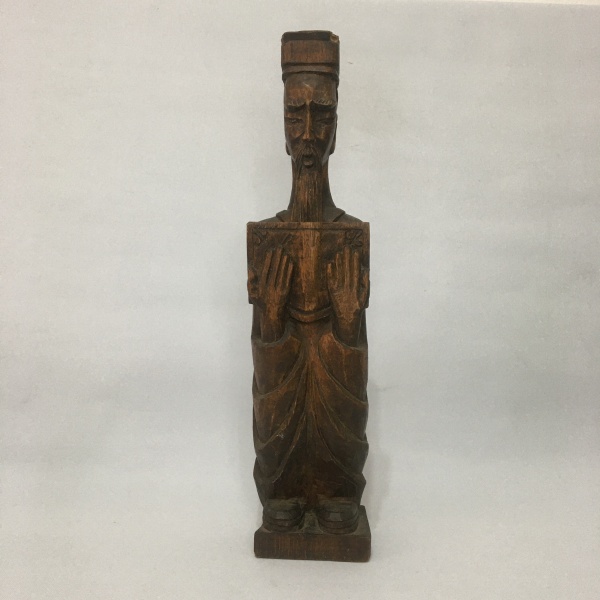 • Antiga escultura oriental em madeira. Base e parte superior com sinais do tempo. Dimensões: 46 cm x 11 cm x 8 cm.