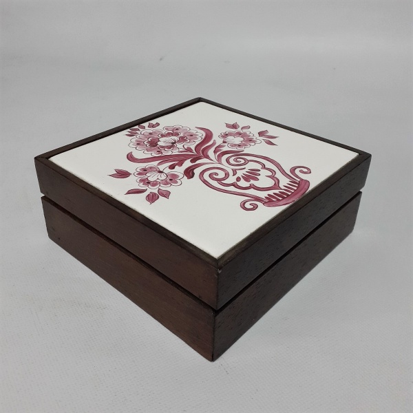 • Caixa madeira tampa cerâmica arranjo floral. Dimensões: 13 cm x 13 cm.