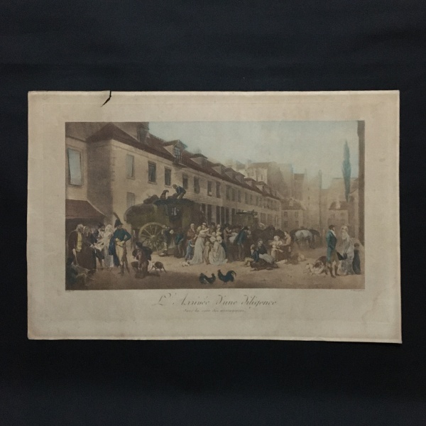 • E. MASSARD - Antiga litografia Francesa " l ', Arriveé J'une Jiligence". Presença de marcas do tempo. Dimensões: 38 cm x 56 cm.