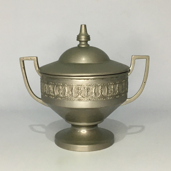 • Antigo açucareiro em metal cinzelado , decorado com faixa estilizada. Marcas de desgastes. Dimensões: 14 cm x 17 cm x 7 cm.