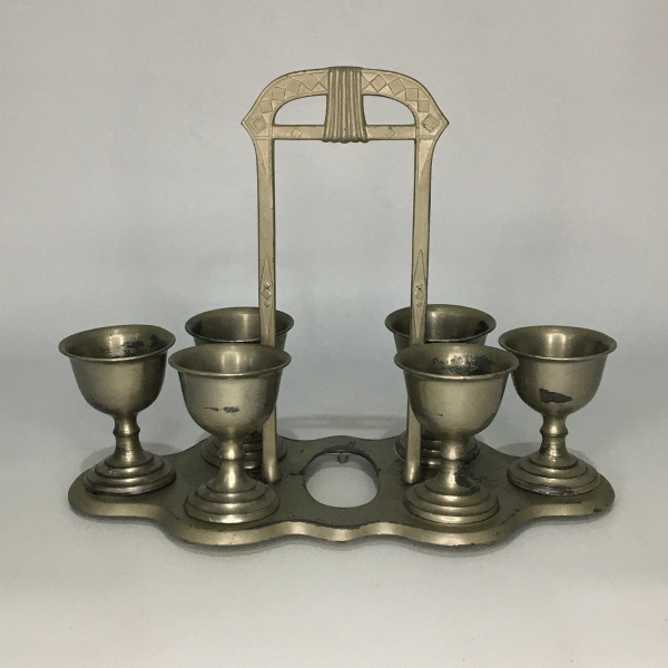 • Antigo Conjunto com seis cálices em metal cinzelado com suporte. Marcas de desgastes. Dimensões:  suporte: 19 cm x 25 cm / cálices: 6 cm x 5 cm.