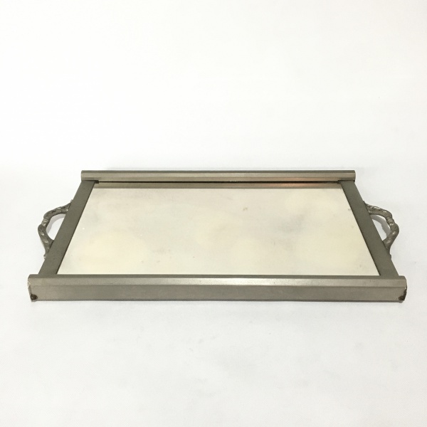 • BARILI - Antiga Bandeja espelhada em metal cinzelado, formato retangular, com alças decoradas em arabescos. Pequenos sinais de desgaste. Dimensões: 26 cm x 46 cm.