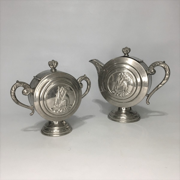 • Antigo conjunto com BULE E AÇUCAREIRO em metal cinzelado , bojo circular ,decorado com figura de embarcação em alto relevo. Pega , alça e bico decorado com folhas de acanto. Dimensões:  Bule 17 cm x 19 cm e açucareiro 15 cm x 18 cm.