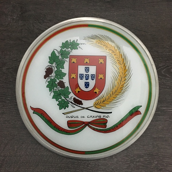 • Belíssimo Brasão "CLUBE SOCIAL CAMPONESES DE PORTUGAL - DUQUE DE CAXIAS RJ", pintado à mão sobre vidro circular convexo com borda em metal cinzelado. Dimensões: