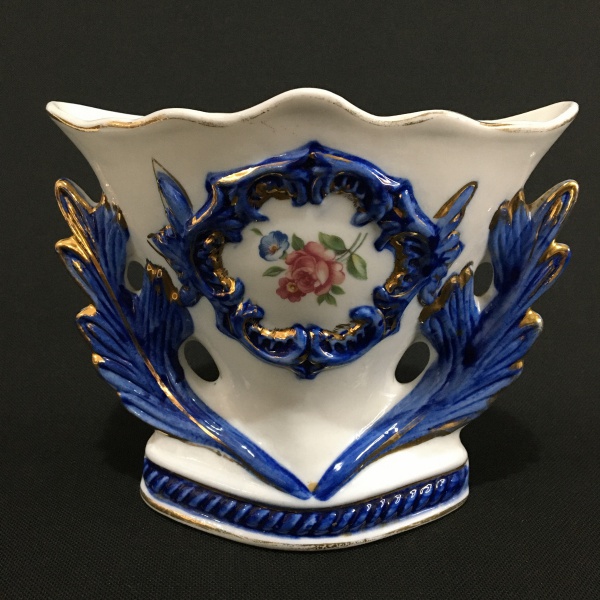 • Gracioso vaso floreira em cerâmica esmaltada decorado com folhas de acanto , estilizados na cor azul , arranjos florais e realces pintados a ouro. Dimensões:14 cm x 17 cm x 7 cm .