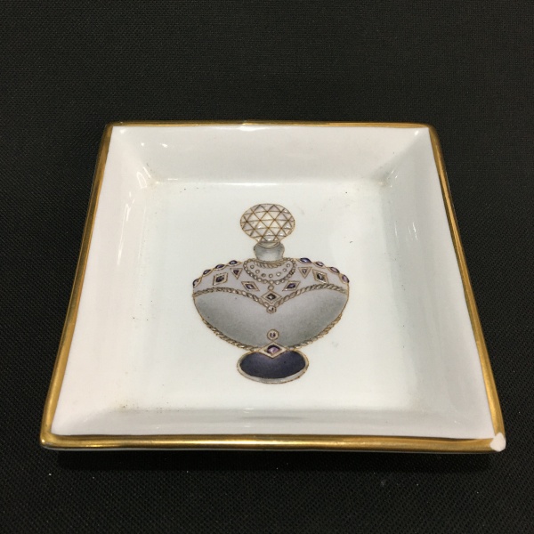 • Antigo porta-cartões em porcelana esmaltada na cor branca, decorado com figura de perfumeiro, pintado à mão com borda pintada à ouro. Pequeno bicado na borda. Exemplar parte de coleção. Dimensões:13 cm x 13 cm.
