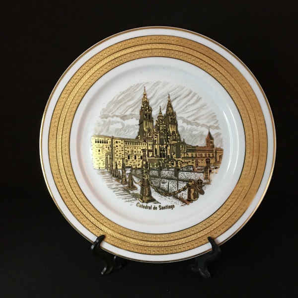 • Luxuoso prato em porcelana  com imagem de Catedral ao centro ricamente ornado a ouro 22k. Dimensões: 26 cm.