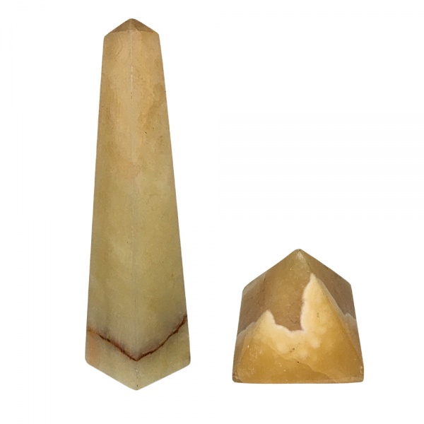 • Antigo obelisco e pirâmide feitos de alabastro. Dimensões: 23 cm x 5,5 cm (maior peça).