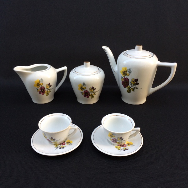 • Belo conjunto para Café "Tete à tete" em fina porcelana, anos 70, com belíssima decoração floral e filetes pintados à  Ouro. Manufatura: Rami Jundiaí. Exemplares em excelente estado de conservação. Dimensões: Bule - 15,5 cm x 20,5 cm. Capacidade - 550 ml.Leiteira - 10,5 cm x 14 cm. Capacidade - 250 ml.Açucareiro - 11,5 cm x 10 cm. Capacidade - 200 g.Xícaras - 5 cm x 7,5 cm. Capacidade - 50 ml.Pires - 10,5 cm diâmetro.
