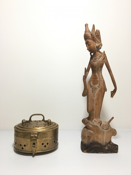• ÍNDIA - Bela escultura  de Divindade, esculpida em madeira. Apresenta pequenas perdas. Dimensões: 30 cm x 9 cm x 5 cm. / Caixa fenestrada em metal dourado.