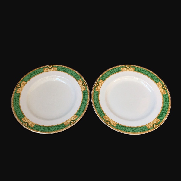 • WOODS IVORY WARE ENGLAND - Antigo par de pratos rasos em "Faiança Inglesa Cerca de 1930 +" decorados com faixa e estilizados em tons de verde e amarelo. Borda filetada à Ouro. Selo ao fundo com numeração. Discretos craquelados ao centro, detalhes característicos da Faiança. Exemplar de coleção e em excelente estado. Dimensões: 22 cm diâmetro.