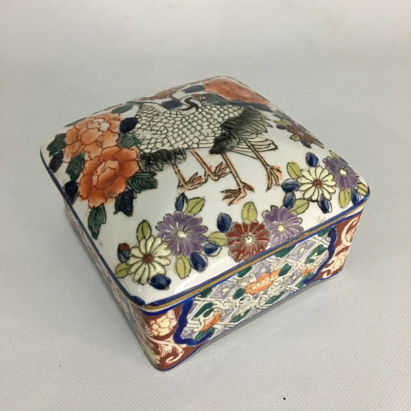 • Belo porta-joias em porcelana oriental policromada, decorado com flores e aves. Presença de restauro imperceptível na lateral. Dimensões : 5 cm x 9 cm x 9 cm .